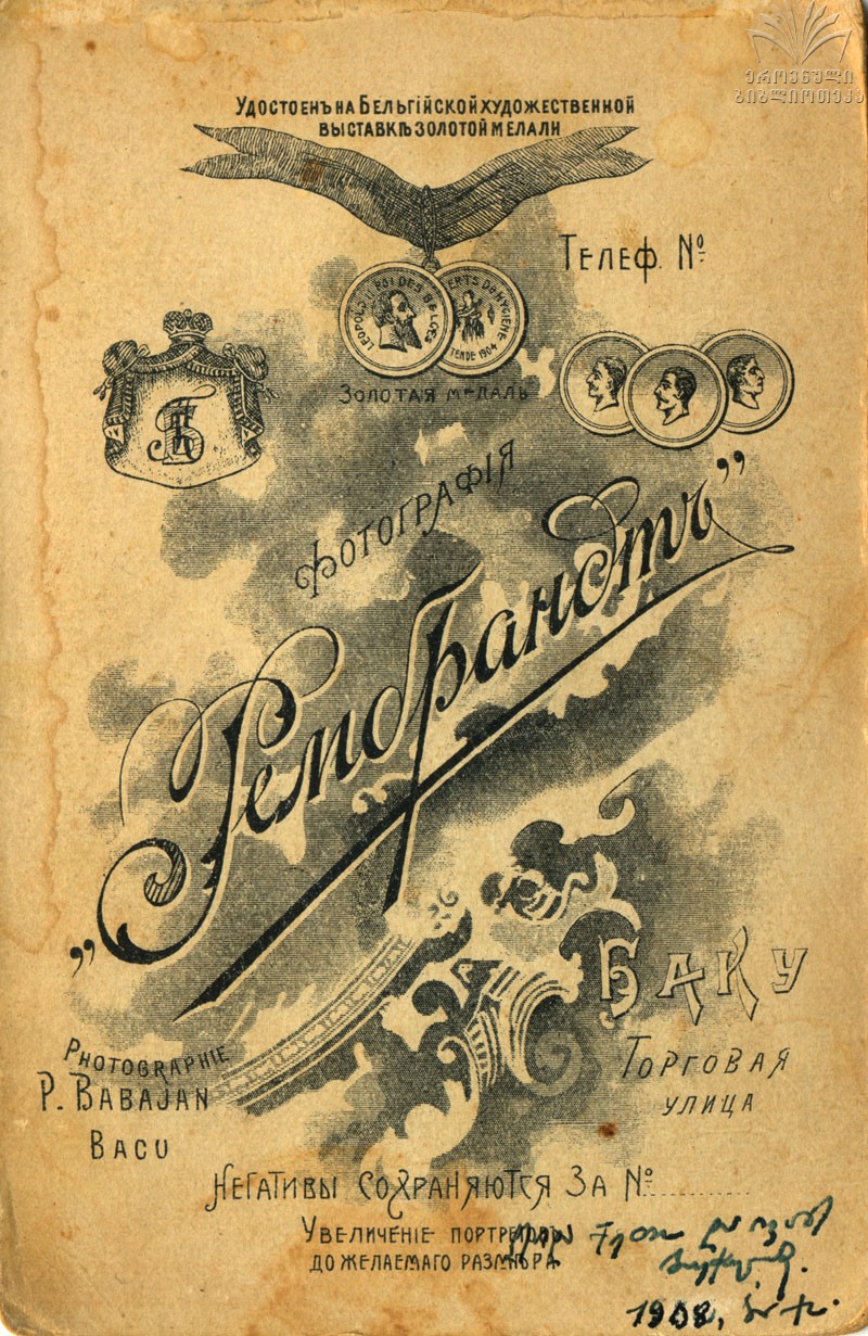 R. Babayan R. Babayan Title Portrait of two men Region Azerbaijan, Russian Empire Year 1900s Decade 1900թթ Media gelatin silver photograph Genre portrait Collection Lusadaran Armenian Photography Foundation, Yerevan Source Lusadaran Armenian Photography Foundation, Yerevan R. Babayan Title Studio backstamp Region Azerbaijan, Russian Empire Year 1900թթ Decade 1900թթ Source Lusadaran Armenian Photography Foundation, Yerevan ×