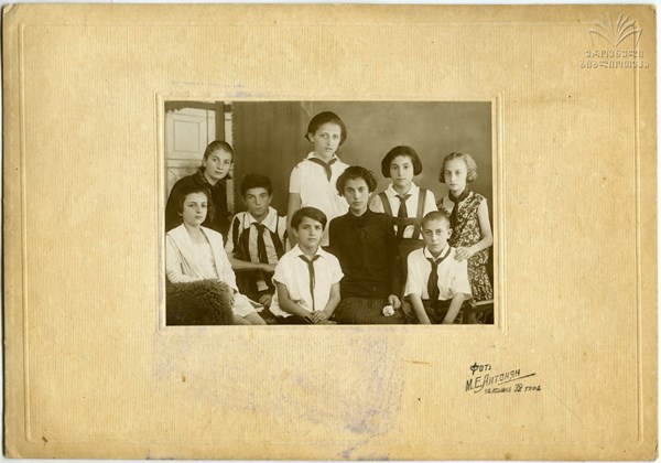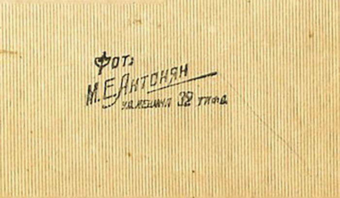 The facts regarding M. E. Antonyan’s life and work are scant. His studio was located on 32 Lenin Street in Tbilisi. It worked during the 1930s and nearly all of Antonyan's photographs located by us come from that decade. Regardless of the social status of his clients, the photographer tried to present everyone with sensitivity and dignified poise. Evenly lit and with carefully balanced compositions, these portraits are technically masterful. In particular, those that represent women and their children are distinguished by their soft aesthetic charms which has certain parallels with the earlier works by Tiflis-based Armenian photographer H. Mirakyan.
