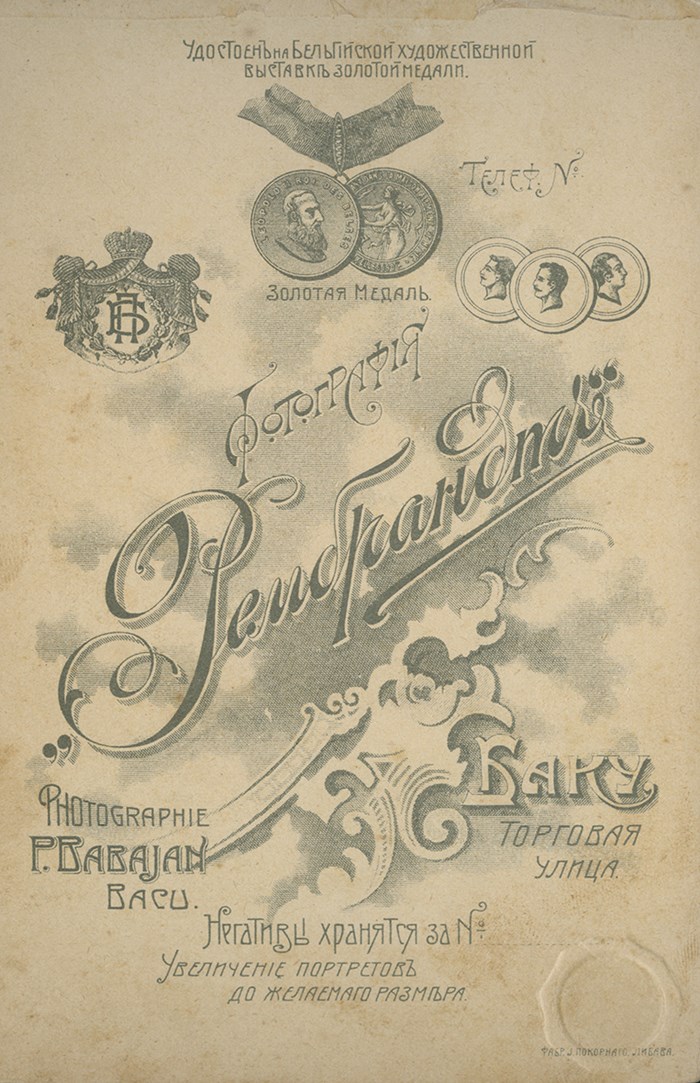 R. Babayan was the sole proprietor of one of Baku’s most popular photographic studios, ‘Rembrandt’. Famous in his time, Babayan was a typical example of a photographer-businessman and his establishment prospered during the oil boom in Baku in the 1900s. A number of Armenian writers, such as Shirvanzade, have used Babayan’s personage in their literary works set in Baku. The ‘Rembrandt’ studio produced exclusively portraits of Baku’s middle and upper classes. Babayan’s clientele was cosmopolitan and was not limited to the local Armenian community. His photographs are professionally made, but do not deviate from standard late 19th century studio aesthetics. Though we are not aware of any works by him with ‘artistic’ aspirations, Babayan did participate in an international art show in Belgium where, according to his studio backstamp, he was given a gold medal. It appears that after the advent of Soviet rule in Azerbaijan, the studio was closed or nationalized.