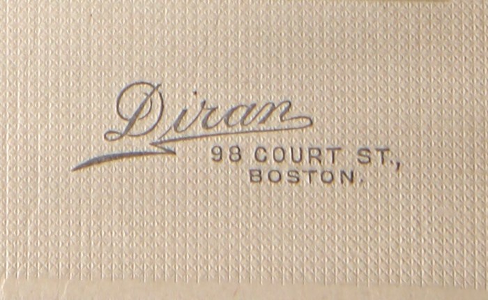 Facts regarding Arsen Diran’s biography are scant. His photography pavilion was located at 98 Court Street in Boston and was established by 1901 at the latest. (1) We don’t know where the photographer was from originally or when he immigrated to the USA. Diran’s customers were mainly representatives of Boston’s middle classes and members of the Armenian community. His portraits are elegantly staged and photographed through a very masterful use of soft lighting and balanced compositions. The photographer, however, was not especially interested in making ‘character’ portraits and his photographs rarely go beyond the task of capturing a pleasant but stiff likenesses. According to historian Marc Mamigonian, Arsen’s younger brother, Suren, was also involved in the photography business, though whether the brothers worked together or separately is not entirely clear. (2)