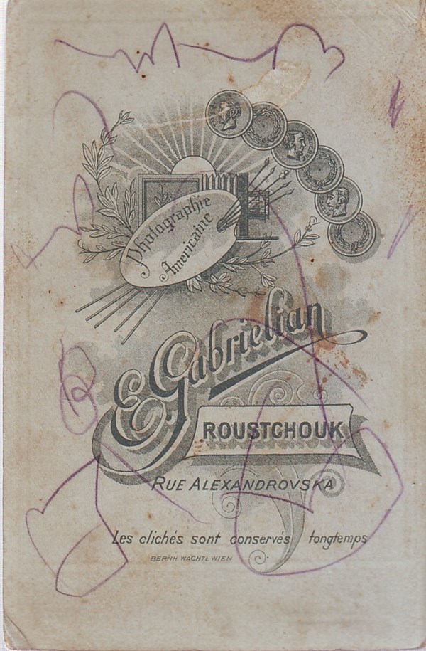No bibliographical or archival traces have been discovered regarding this photographer based in one of the more prominent Armenian colonies in Bulgaria, the city of Rousse. Notably, the photographer’s seal is in French and Gabrielyan presented himself as an ‘American’ photographer. Gabrielyan specialised in conventional studio portraiture and his surviving photographs suggest that the studio operated at least until the First World War.