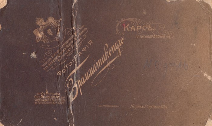 The photographs produced by Grammatikopoulou’s pavilion are predominantly cabinet portraits and full-plate ensemble sittings. As evidenced from the clothing and inscriptions of his portraits, a considerable number of photographers’ clients were the servicemen from the Russian military base in Kars, as well as their families. According to the info on the studio’s seal, Grammatikopoulou was awarded by Prince Vorontsov-Dashkov – the special imperial envoy in the Caucasus – probably for his services to the Russian army. Nevertheless, the photographers’ general customer base was comprised of the local Armenian, Greek and Georgian residents of Kars.