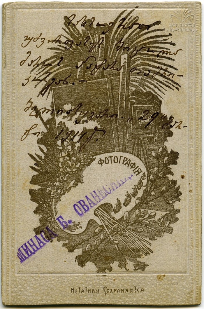We have been unable to trace the any biographical details concerning Minas Hovhannisyants’ life and practice. It is known only that the photographer worked in a town located in Georgia, possibly Tiflis or Batumi. Only a few photographs bearing his seal have surfaced during our research from which we can conclude thatHovhannisyants was largely making studio portraits. These portraits are of generic quality and have little appeal beyond their historical-memorial functions.