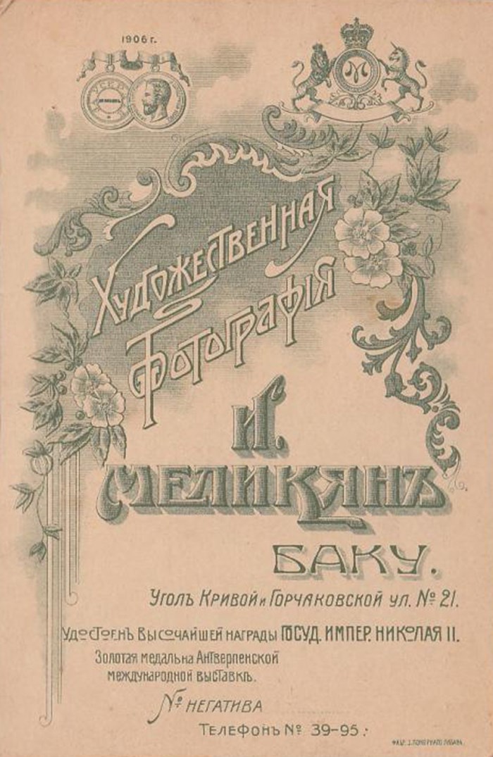 I. Melikyan's photography studio operated briefly in Baku at the commercial house of Tagiev Brothers on Torgovaya Street. Established in the late 1890s, it primarily serviced the city's working and intellectual classes. Amidst his more conventional portraits, the studio sittings of musicologist Father Komitas and actors Duryan-Armenyan and Armen Armenyan (1903) are of special interest. They indicate that Melikyan had connections and was involved with the Armenian intellectual circles in Baky. Other biographical details have yet to surface.