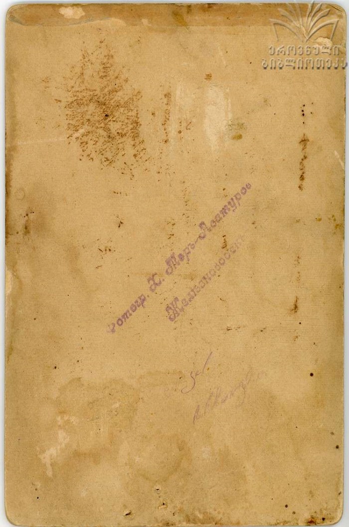There are no precise facts pertaining to the activities of Kh. Ter-Asaturov, who worked at a number of small towns in Russia’s Stavropol region at the beginning of the 20th century. Judging from his photographs, Ter-Asaturov founded his business in Gyorgievsk at the end of the 1890s and later moved to the nearby town of Zheleznovodsk. Being one of the few photographers working in these settlements, Ter-Asaturov photographed any paying member of the local population. The photographer specialised only in portraits, which he shot both indoors and outdoors. Amidst these, of special interest are the portraits of locals posing as Caucasian ‘ethnographic types’ by donning folk costumes. The photographer’s studio appears to have closed after the 1917 Bolshevik revolution.
